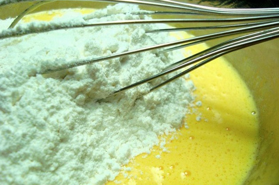 – Đánh đều hỗn hợp lòng đỏ trứng-đường-vani thật đều cho đến khi có màu hơi nhạt thì cho thêm 80 gram bột và tiếp tục khuấy đều tay.